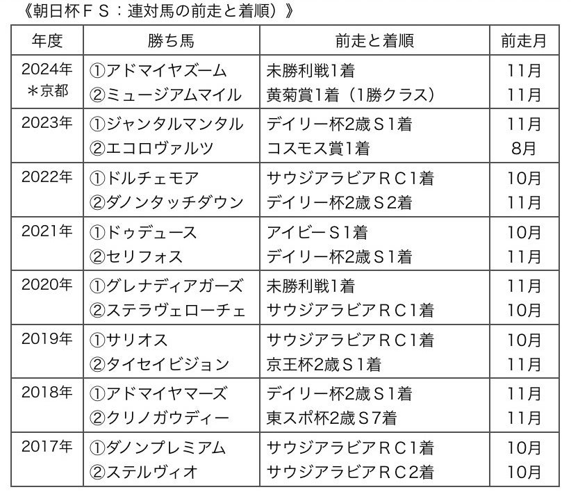 ちなみに2024年は京都開催で、いわば例外的な年になりますが、直近のレースに勝ち(重賞の場合は連対し)、その勢いのまま朝日杯FSで好走していることが明確ですね。