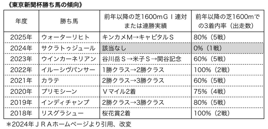このデータは2024年のJRAホームページに掲載されていたものをアレンジしたものですが、近年の東京新聞杯は高いマイル実績を持つ馬が勝つ傾向にあるようで、過去8年間の勝ち馬8頭中7頭は次のいずれかに該当し、