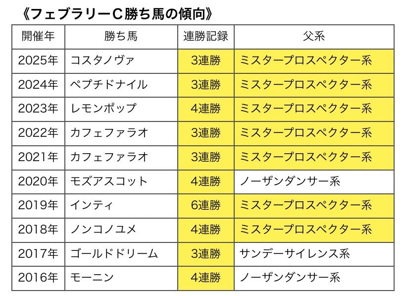 このデータは今年のJRAホームページに掲載されているものですが、過去10年間のフェブラリーS勝ち馬は以下3点の共通点があるとのこと。