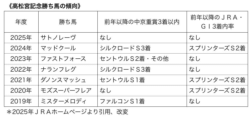この傾向は2025年のJRAホームページに掲載されているものですが、過去7年間の高松宮記念勝ち馬のうちの5頭は、前年以降の中京重賞で3着以内に好走した実績があるとのこと。