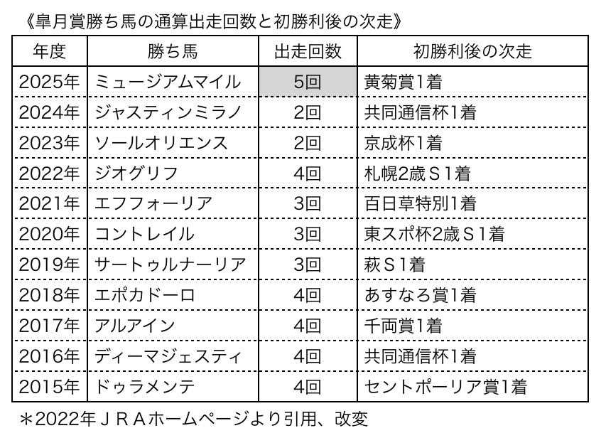 このデータは2022年のJRAホームページに掲載されていたものをアレンジしたものですが、2015年以降(過去11年間)の勝ち馬は全て、以下2つの項目を共にクリアしています。
