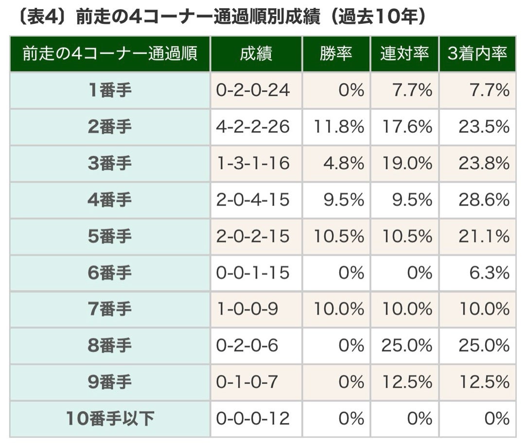 今年は以下10頭が前走4角2番手から5番手の間に通過した馬に該当していますが、好走馬の7割が該当していた好走パターンだけに、この中から複数頭が好走する可能性は高いだろうと思います。