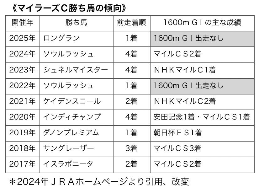 このデータは2024年のJRAホームページに掲載されていたものをアレンジしたものですが、2017年以降のマイラーズC勝ち馬9頭は全て「前走4着以内」に好走しており、かつ9頭中7頭は「マイルGⅠで3着以内に好走」した実績があったとのこと。