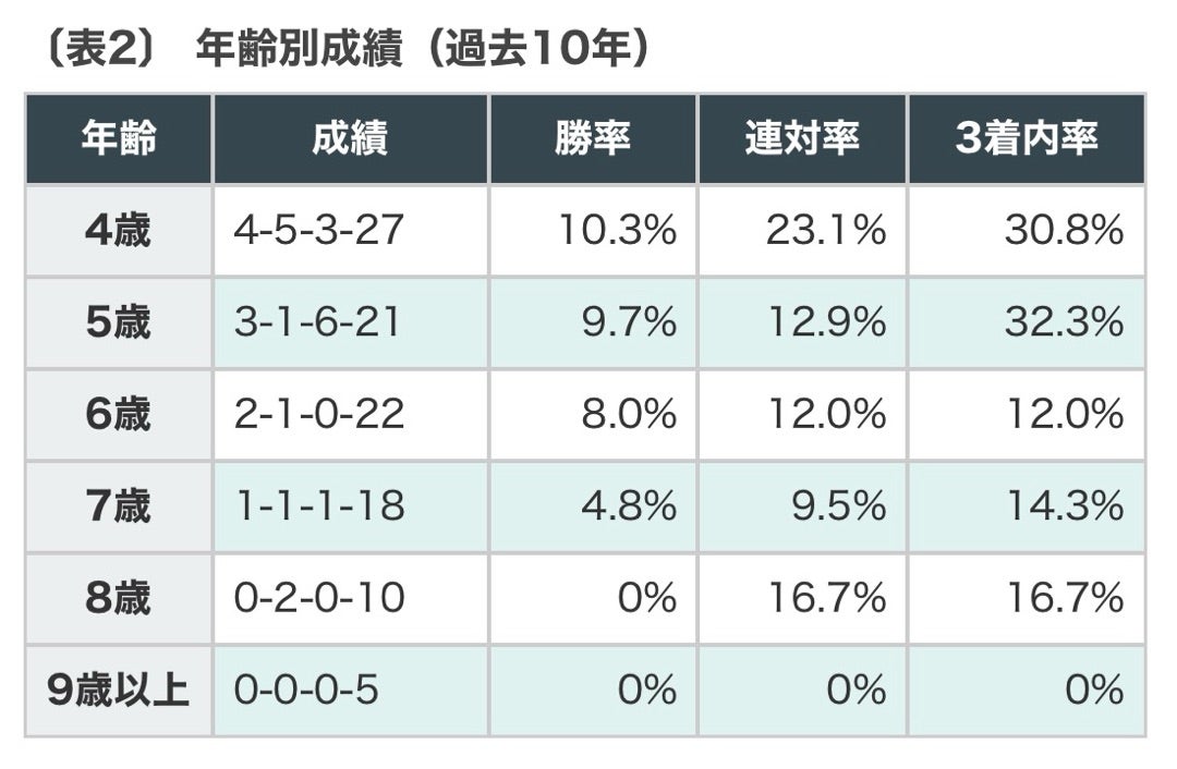 4・5歳馬トータルで7-6-9-48(3着内率 31.4%)と、好走馬30頭中22頭を占めており、例年通りなら少なくとも2頭以上は4・5歳馬が好走することになりそうです。